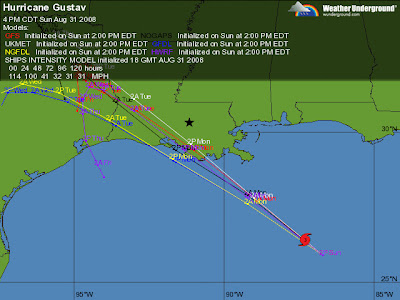 Gustav's predicted track on Wunderground.com has shifted a little west. Two of the six models (the purple and red lines) show him coming close to BR. If he were to follow the blue line, he'd make landfall very close to where Camille made landfall, and will also re-damage a lot of the area that was affected by Katrina. I think The yellow line takes it near at Galveston. Read Isaac's Storm by Erik Larson for a terrific history of the 1900 Galveston storm, one of the deadliest in history.